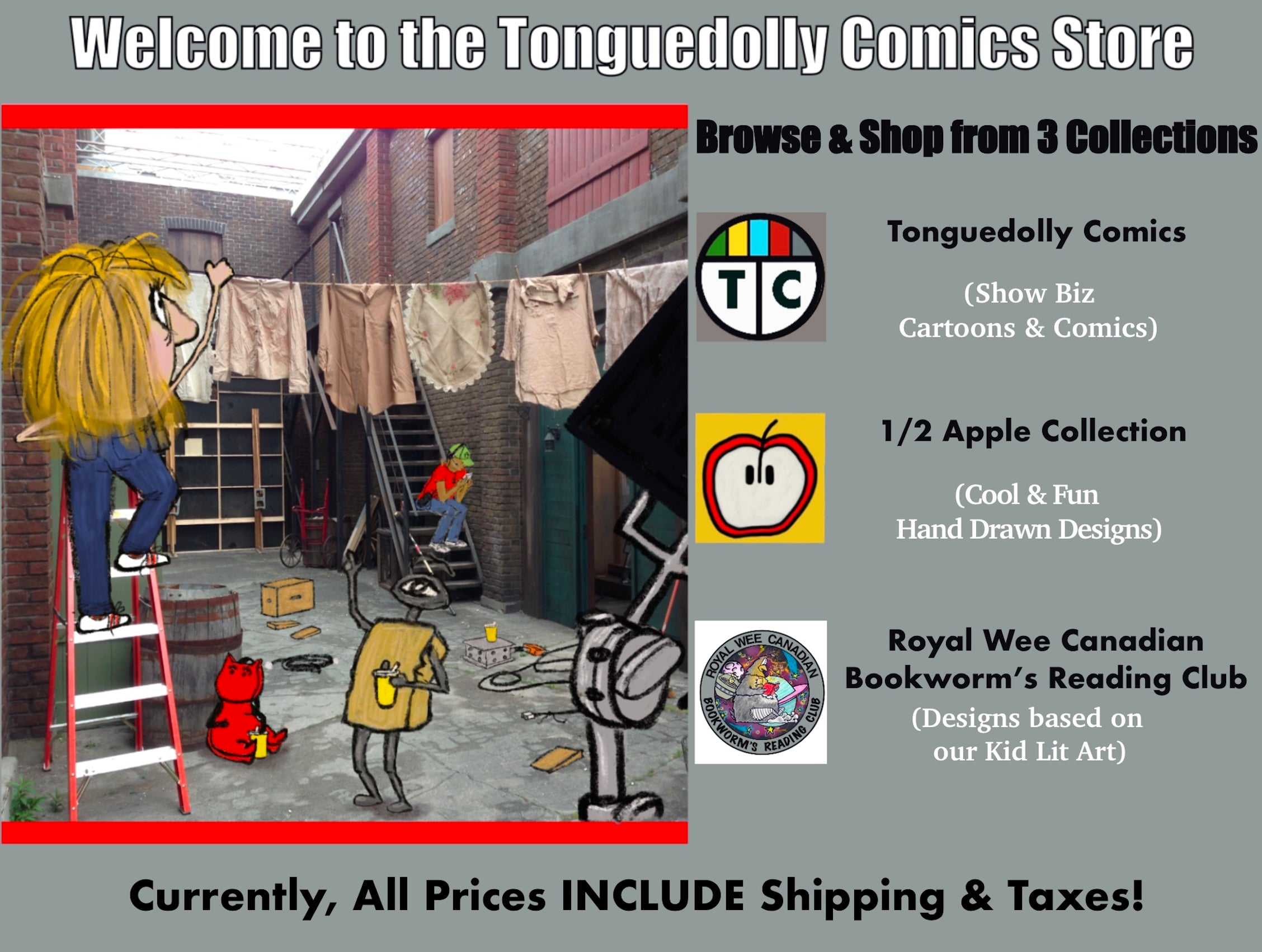 THE TONGUEDOLLY COMICS IS A DESIGN BUSINESS. WE SELL THE DESIGNS THAT ARE PRINTED ON T-SHIRTS, & OTHER PRODUCTS, THAT YOU ORDER FROM THIS STORE'S SITE, BUT ARE THEN FULFILLED BY PRINT ON DEMAND (POD) COMPANIES SUCH AS SLAITE, OR GELATO. HALF APPLE STUDIOS DOES NOT HAVE ANY STOCK, WE DO NOT MAKE THE MERCHANDISE THAT YOU ORDER.