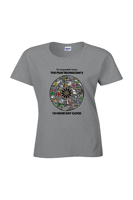 The Tonguedolly Comics, Film Technician's 18hr Day Clock No BG, Gildan 100% Cotton, Women's T-Shirt