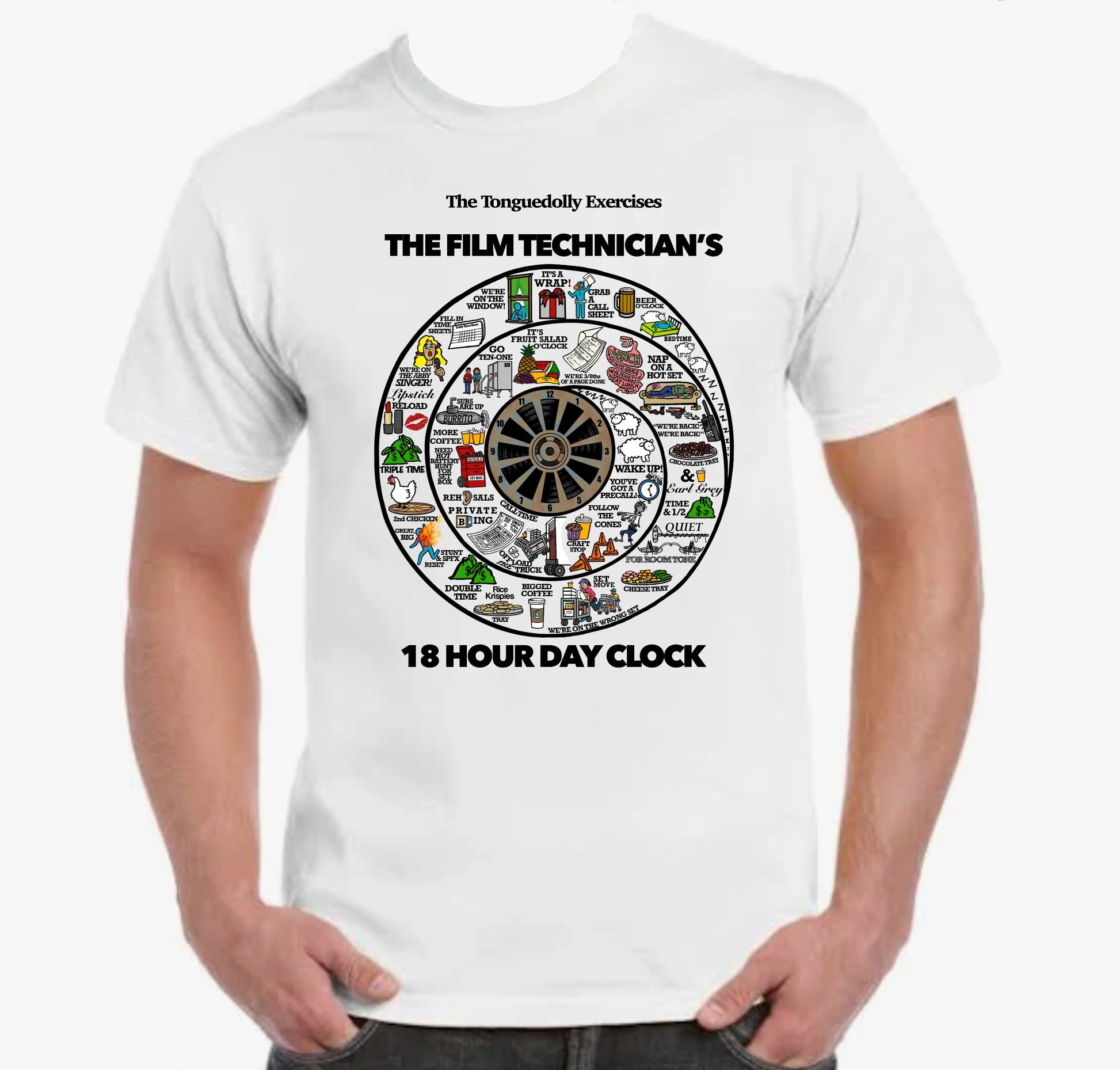 Pretty much every film technician can relate to everything described in the 18 Hour Day Clock, from the stop at Craft Service for breakfast before crew call, or precall, to landing on the last shot of the day, either "the Window" or the Abby Singer" depending on what side of the border you're filming, and finally to hearing the magic words, "IT'S A WRAP!"